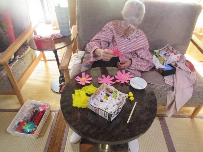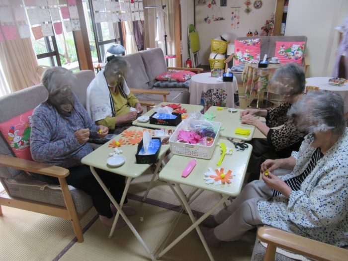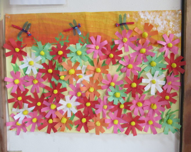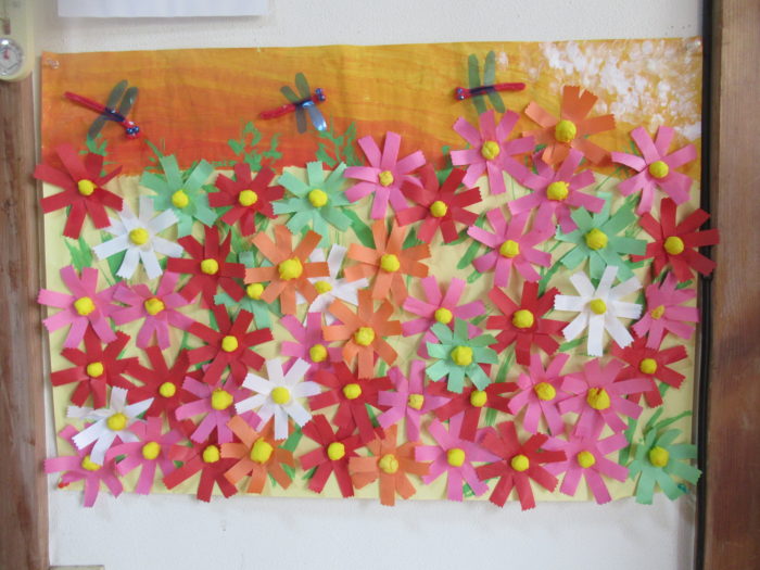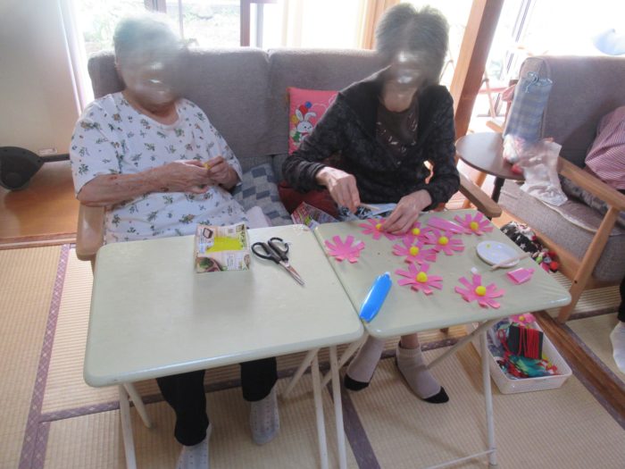 みなさん、集中してお花を作っていました。貼り付ける時も「そこに貼ったらいいよ!」「ここにも貼ったほうがいいかしら?」等色々と話し合いながら完成させてくれました!