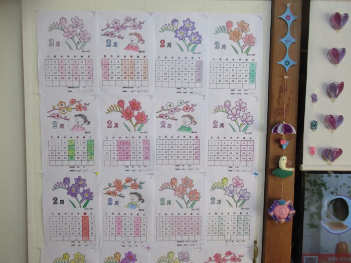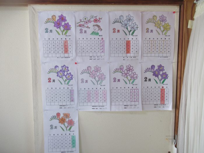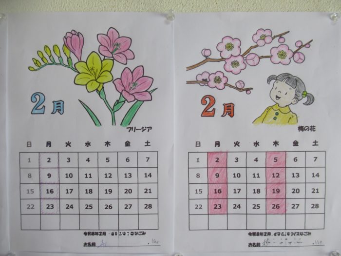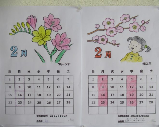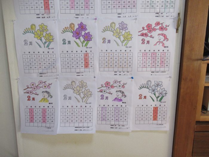 2月のカレンダーは塗り絵を用意しました。『梅の花』と『フリージア』です。